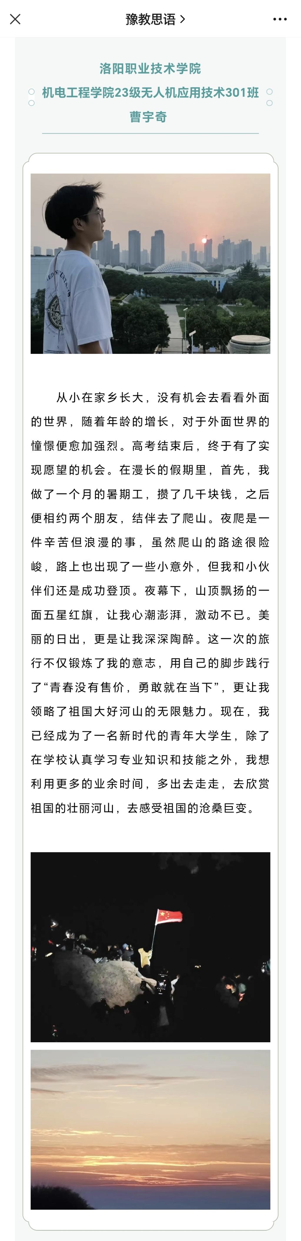 编者按:2023年11月30日,豫教思语报道青年说 | 与其迷茫,不如去闯其中有我校学生。报道原文及相关链接如下: