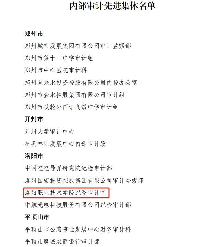 12月17日,河南省内部审计协会公布了《关于表彰2020至2022年内部审计先进集体和先进工作者的决定》,我校纪委审计室获评“全省内部审计先进集体”荣誉称号。