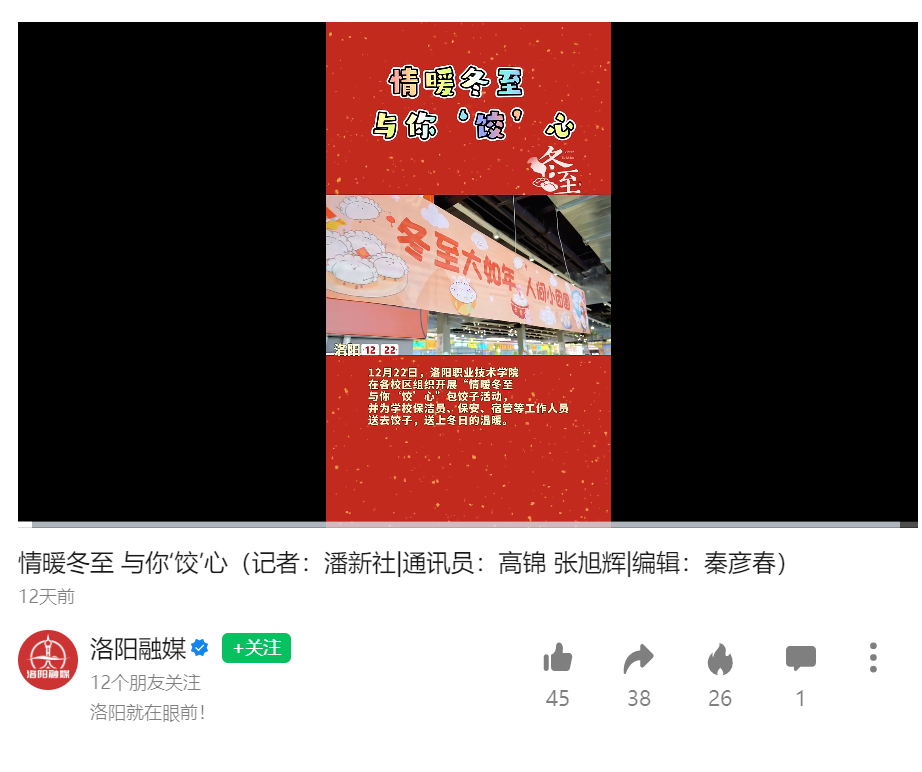 2023年12月22日,洛阳融媒微信视频号报道情暖冬至 与你“饺”心。报道原文如下: