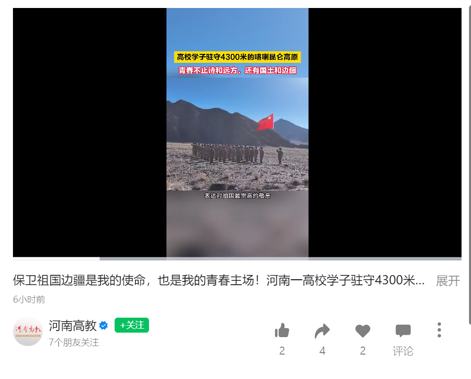2024年1月3日,河南高教微信视频号报道保卫祖国边疆是我的使命,也是我的青春主场!河南一高校学子驻守4300米的喀喇昆仑高原,青春不止诗和远方,还有祖国和边疆!报道原文如下: