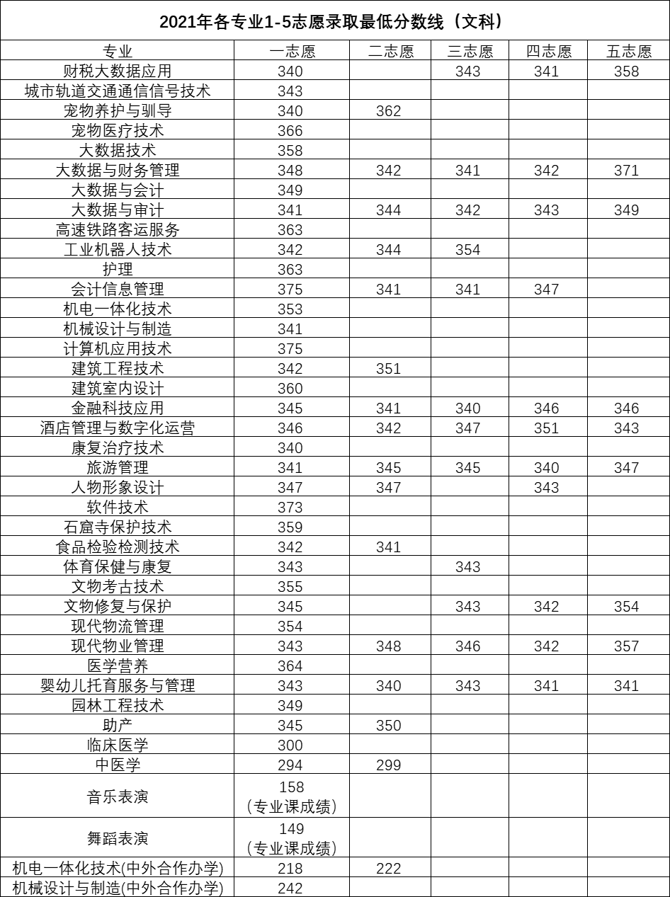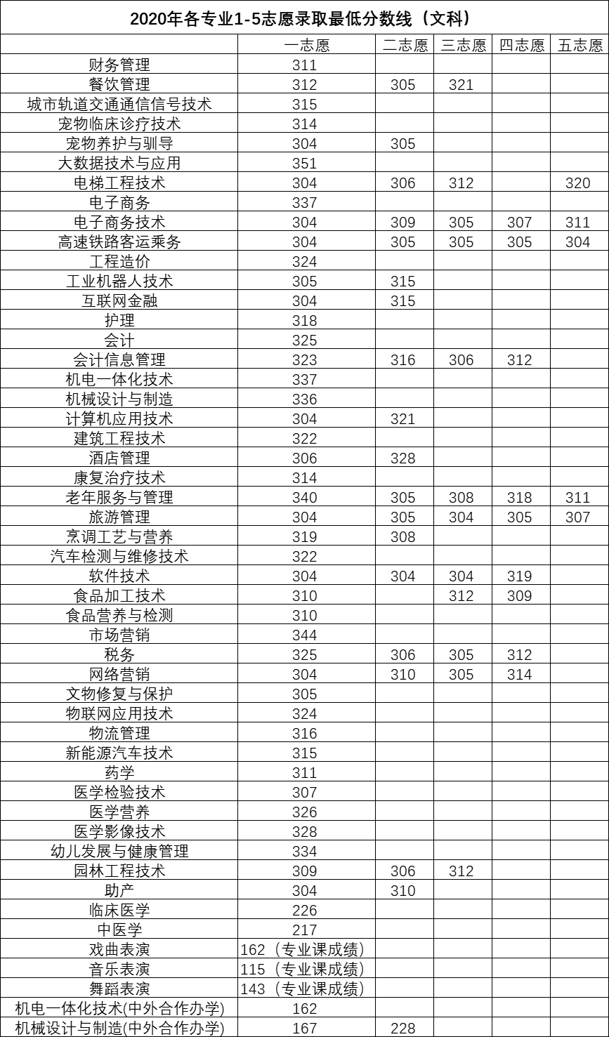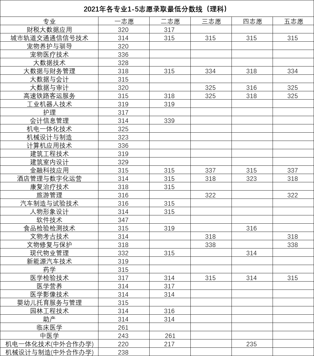 2020-2021年我校各专业1-5志愿录取最低分数线