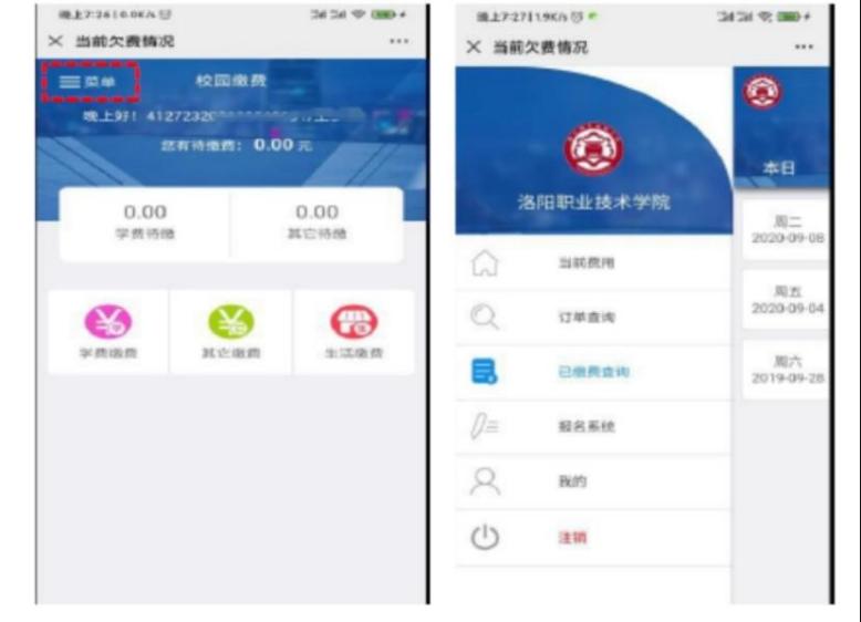 第二步:学生登陆自己账号,点击页面右上角“菜单”选项,选择已缴费查询。
