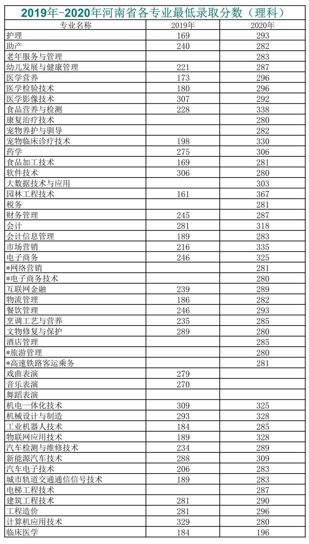 洛阳职业技术学院2019-2020年各专业录取最低分数