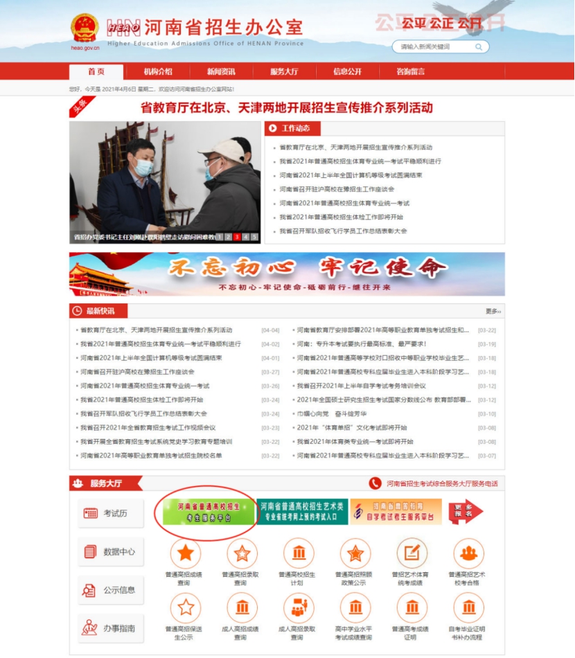 1、登录河南省招生办公室网站(www.heao.gov.cn),选择网上服务大厅栏的“河南省普通高校招生专栏服务平台”链接,进入系统。或者直接访问河南省普通高校招生考生服务平台(https ://pzwb.heao.gov.cn/)。