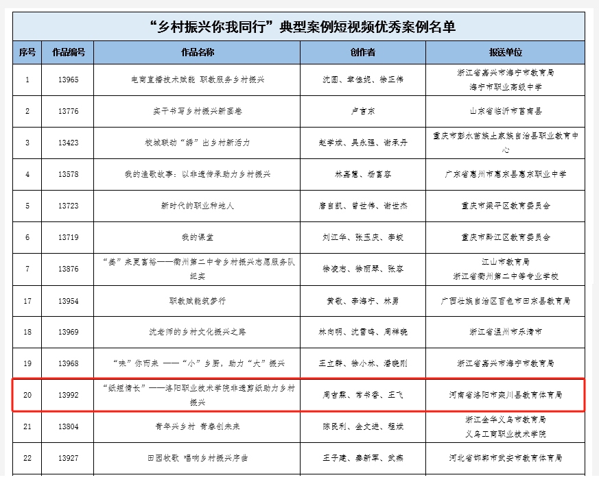 近日,中国教育电视台公布了“乡村振兴你我同行”典型案例短视频优秀案例名单,我校创作的“乡村振兴你我同行”典型案例短视频作品《“纸短情长”——洛阳职业技术学院非遗剪纸助力乡村振兴》成功入选。
