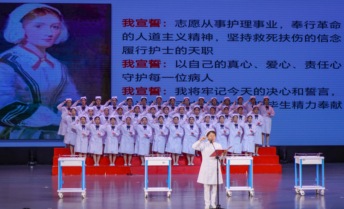 传光授帽宣誓仪式上,临床一线护理人员和护理与康养学院教师上台为护生代表戴上圣洁的燕尾帽,并带领全体护生庄严宣誓。