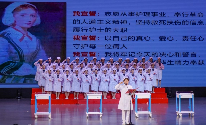 传光授帽宣誓仪式上,临床一线护理人员和洛阳职业技术学院护理与康养学院教师上台为护生代表戴上圣洁的燕尾帽,并带领全体护生庄严宣誓。