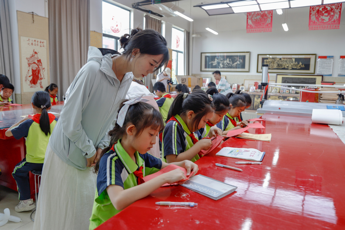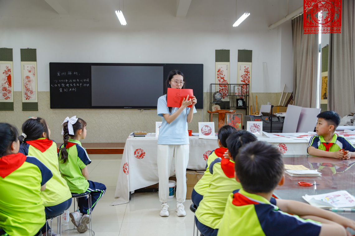 在王飞大师剪纸工作室,在洛职学子的悉心指导下,小学生们亲自动手开展剪纸实践,感受中国传统文化的魅力。全神贯注地投入,成功完成了一幅精美的剪纸作品。