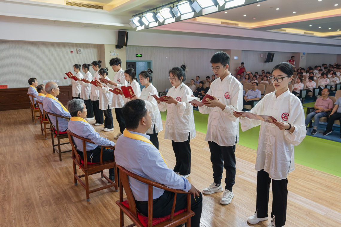 仪式上,来自我校基础医学院2023级中医学订单定向班的58名学生齐声诵读《拜师帖》,并向教学老师敬送拜师贴、行拜师礼、敬拜师茶,表达对教学老师的尊敬和感激之情。教学老师向学生们赠送书籍、颁发师承证书,并鼓励学生们在未来的学习和工作中继续努力,传承和发扬中医文化。