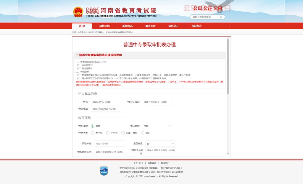 河南省教育考试院官网→服务大厅→网上服务→普通中专录取审批表办理。