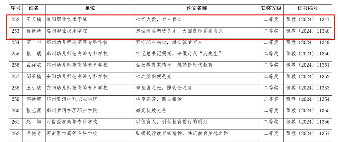 在师德主题教育征文比赛中,我校食品与药品学院魏笑参赛论文《走职教路,谋职教事,做职教人——躬耕教坛、以德树人》获得一等奖;护理与康养学院王若楠论文《心怀大爱,育人育心》、戏曲艺术学院曹艳艳论文《忠诚淡薄塑造良才,大国良师吾辈当先》获得二等奖;医学技术学院刘海强论文《光影之间,医心筑梦——一位医学影像技术专业教师的 教育家精神》、汽车与轨道交通学院尚亚博论文《立德树人:从平凡故事中体会师德光辉》、电商物流学院朱玮玮论文《春润匠心·爱铸未来》获得三等奖。在师德师风优秀案例评选中,我校参评案例《聚焦“三个融合”,打造“两个平台”——洛阳职业技术学院聚力培养 具有教育家精神的工匠之师》荣获优秀等次。