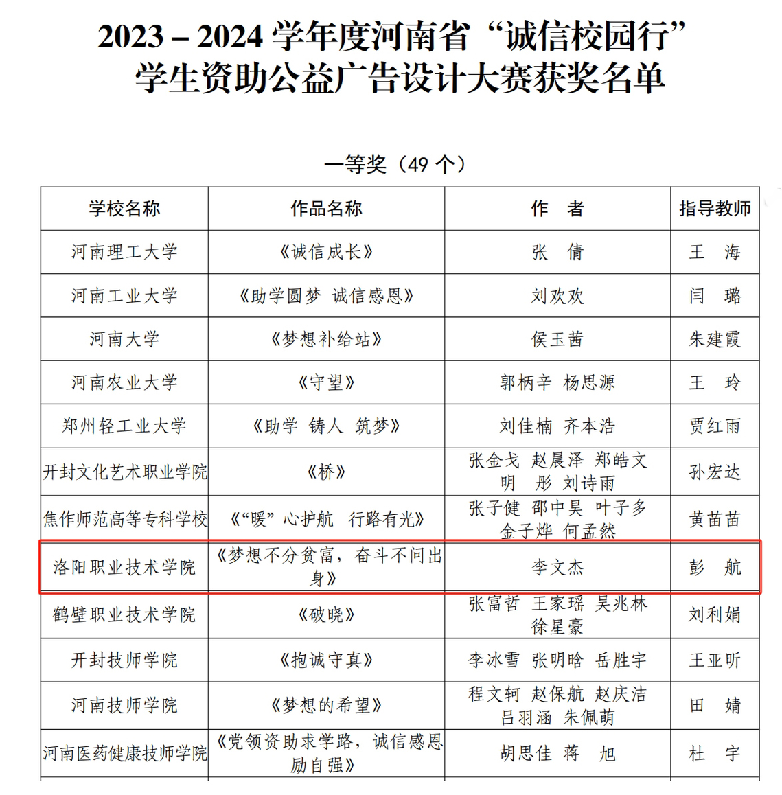 近日,2023-2024学年度河南省“诚信校园行”学生资助公益广告设计大赛结果公布,洛阳职业技术学院参赛作品荣获一等奖。