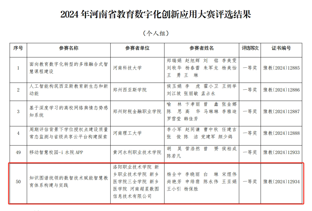 近日,河南省教育厅公布2024年河南省教育数字化创新应用大赛评选结果,我校作为主要完成单位报送的创新应用项目荣获个人组一等奖。