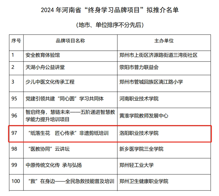 近日,河南省教育厅公布2024年河南省新时代“百姓学习之星”“终身学习品牌项目”名单,我校“纸落生花 匠心传承”非遗剪纸培训项目成功获评2024年河南省新时代“终身学习品牌项目”。