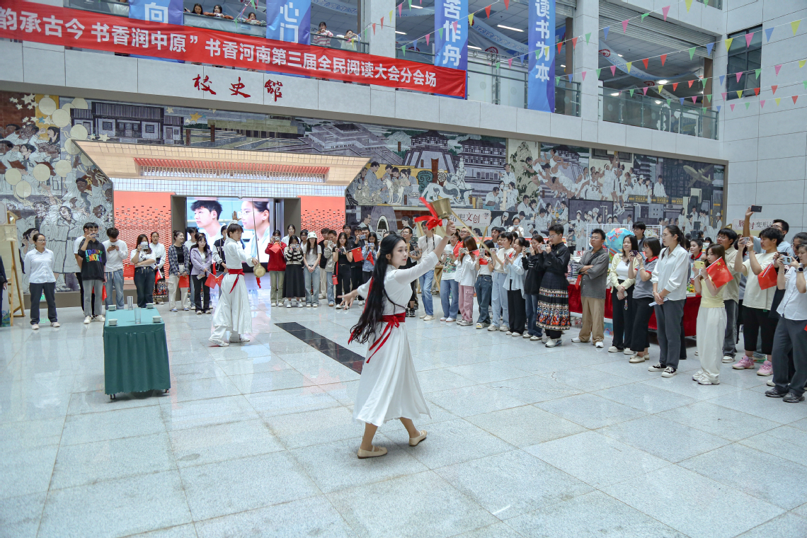 在图书馆二楼举办的“文韵承古今 书香润中原”主题书展活动中,共有新华书店提供的各类图书5000余册参展,为市民和广大师生作图书推荐、好书分享。活动现场,我校各二级学院、学生社团充分利用专业优势,开展非遗体验、文创展示、线上直播等活动,吸引众多学生参与其中。