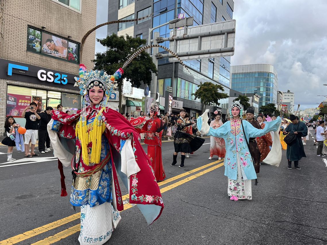 开幕式上,我校师生身着豫剧传统戏服,与来自巴西、日本、蒙古、菲律宾等国家,以及韩国各道市地区的文艺团队一同参加巡游活动。戏曲艺术学院戏曲表演专业教师、国家一级演员朱雪娟现场演唱《穆桂英挂帅》经典片段,生动展现了穆桂英的英勇与豪迈;戏曲表演专业教师雷田田送上了精彩的水袖表演,水袖翻飞、行云流水;戏曲专业学生白婧雯表演的花旦耍手绢,展现了旦角的柔美与婉约……精彩的表演赢得了现场观众的阵阵掌声和欢呼。