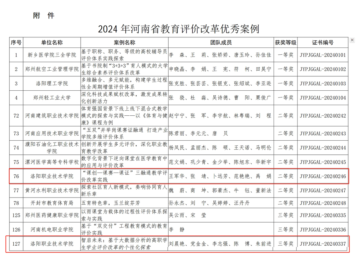 为推动教育评价改革向更深层次挺进,河南省教育厅组织开展2024年河南省教育评价改革优秀案例征集工作,经各地各校推荐、专家评选,共推选出180个优秀案例。其中我校电商物流学院申报案例《“课创-课赛-课证”三融通教学评价改革实践》荣获二等奖,课程中心申报的案例《智启未来:基于大数据分析的高职学生学业评价改革的个性化探索》荣获三等奖。