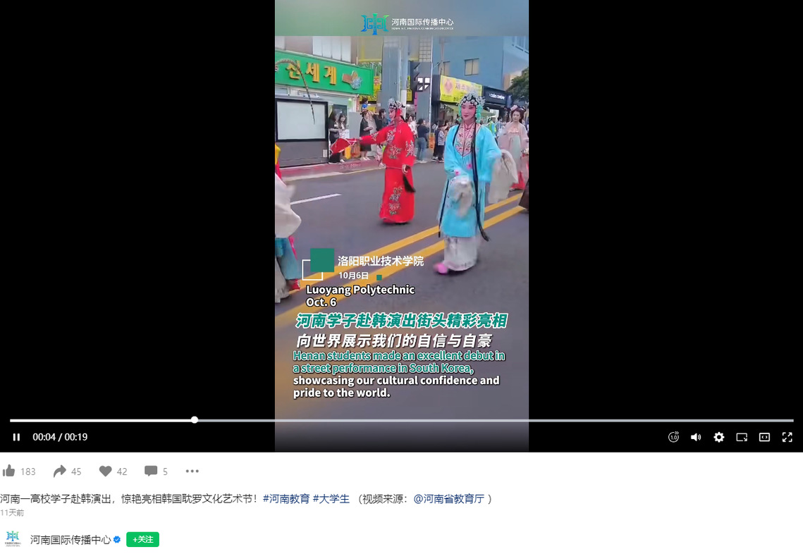 河南国际传播中心视频号:河南一高校学子赴韩演出,惊艳亮相韩国耽罗文化艺术节!