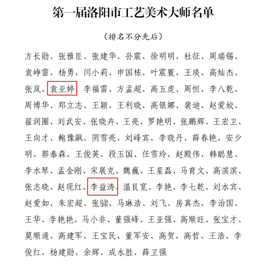 近日,洛阳市工业和信息化局公布了第一届洛阳市工艺美术大师名单,其中我校文物保护考古学院2020级学生袁亚婷、2022级学生李益涛成功入选。