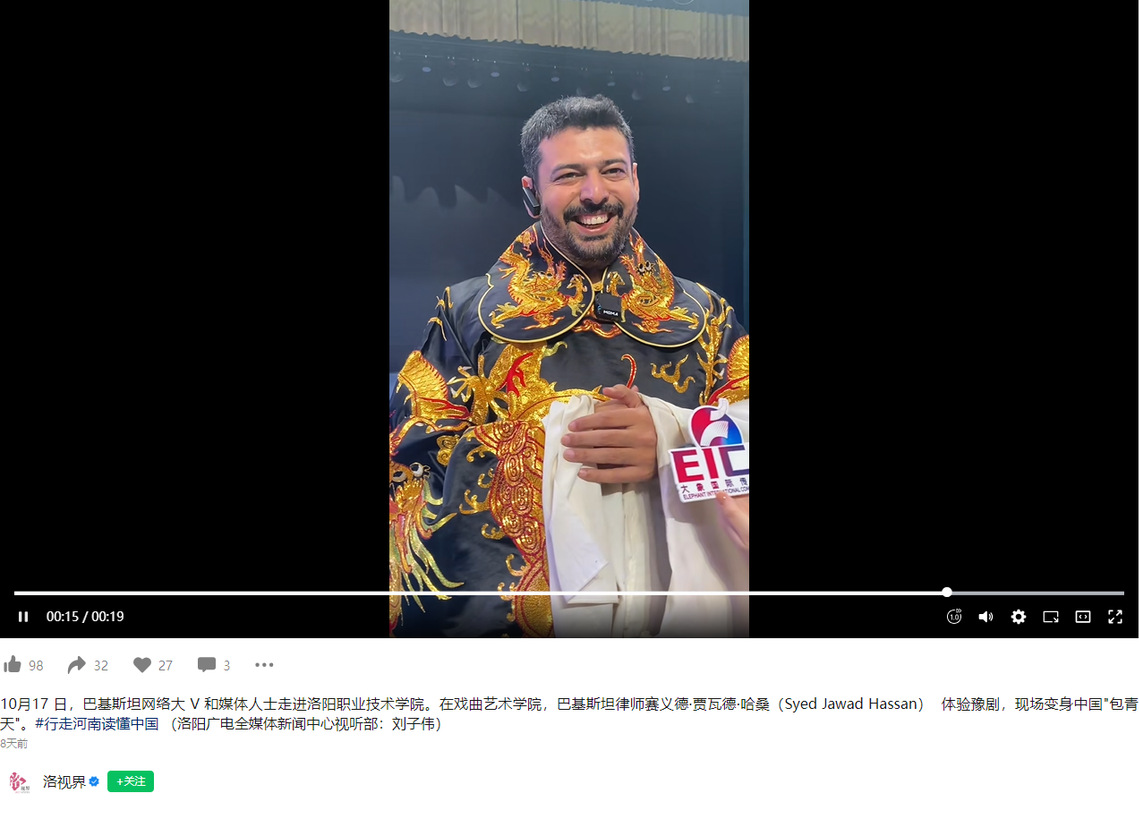 编者按:2024年10月17日,洛阳广播电视台报道巴基斯坦网络大 V 和媒体人士走进洛阳职业技术学院。在戏曲艺术学院,巴基斯坦律师赛义德·贾瓦德·哈桑(Syed Jawad Hassan) 体验豫剧,现场变身中国包青天。报道原文如下: