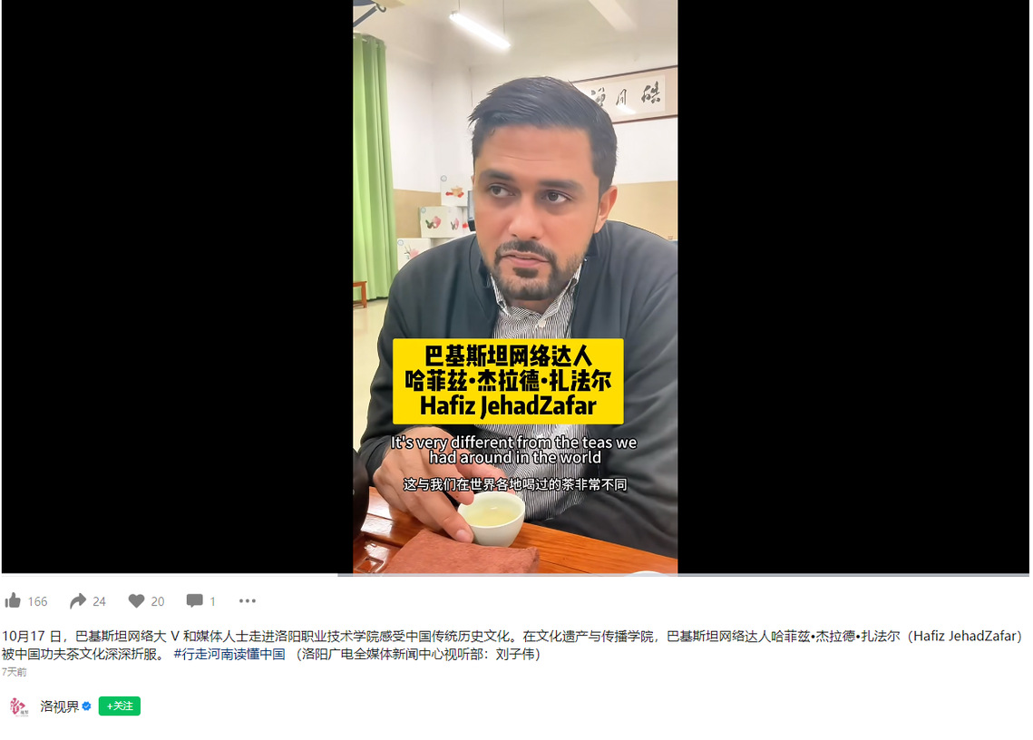 编者按:2024年10月18日,洛阳广播电视台报道巴基斯坦网络大 V 和媒体人士走进洛阳职业技术学院感受中国传统历史文化。在文化遗产与传播学院,巴基斯坦网络达人哈菲兹•杰拉德•扎法尔(Hafiz JehadZafar)被中国功夫茶文化深深折服。报道原文如下: