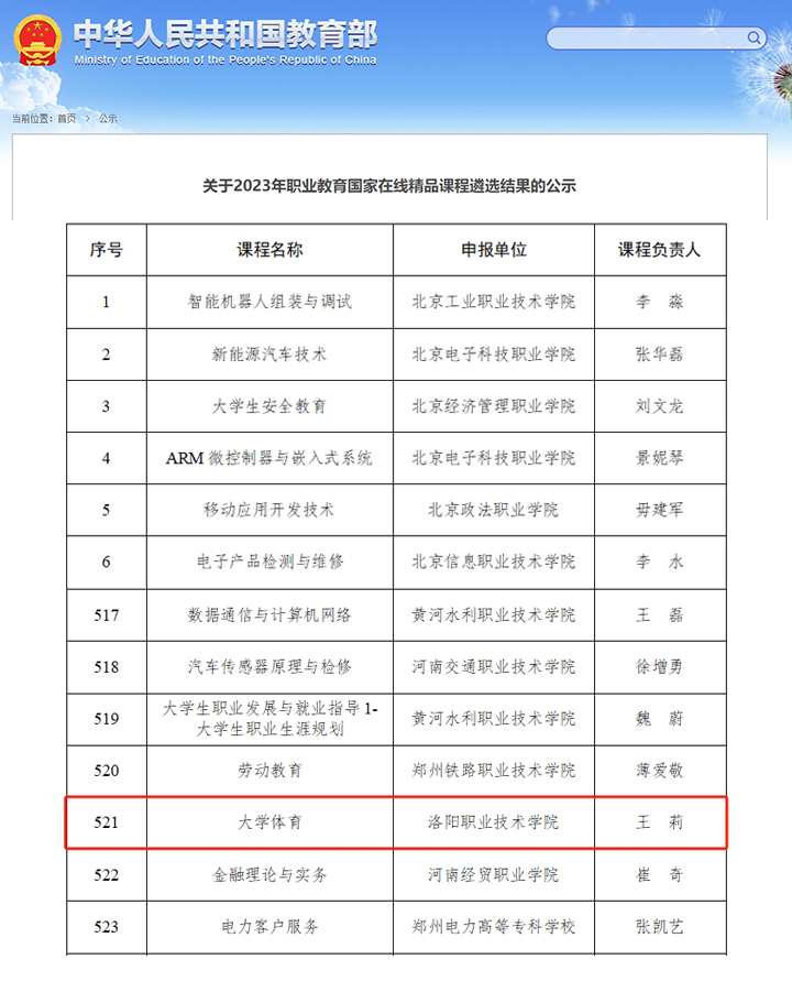 10月23日,教育部正式公布了2023年职业教育国家在线精品课程遴选结果,我校体育教学部主任王莉副教授主持的《大学体育》课入选,为河南省唯一入选的体育类课程。