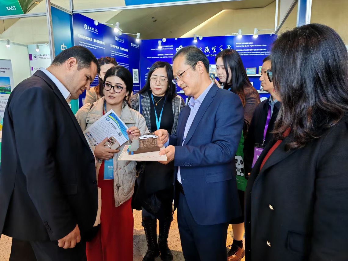 会议期间,我校作为河南省三所受邀参加中国教育交流展的学校之一,展出了非遗剪纸、中药茶饮等特色作品,全面展现了学校在非遗传承、优秀传统文化创新发展等方面所取得的成果,吸引了众多外方嘉宾参观。李保安与外方嘉宾进行了深入交流,详细介绍了近年来学校在国际交流、非遗传承等方面所取得的成绩。