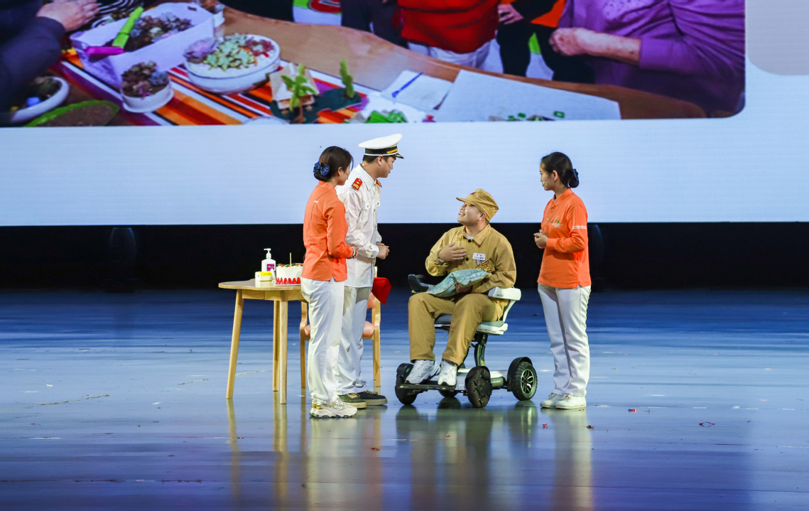 演出现场,我校学生和社区乐养居老人以及社区幼儿园小朋友们一起送上了精彩的文艺表演,展现了我校的积极向上、丰富多彩的校园学习生活和智慧健康养老服务与管理专业群的建设成果。在技能展示环节,通过模拟场景对一名抗战老兵的贴心照护,展现了新时代养老行业的新面貌。