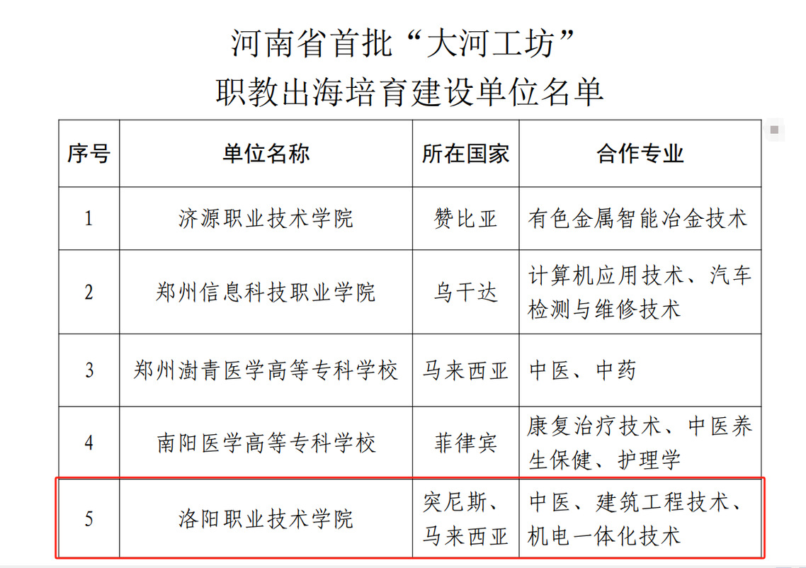 近日,河南省教育厅下发通知(教职成〔2024〕364号),正式公布首批“大河工坊”职教出海建设项目立项建设单位及培育建设单位名单,我校成功入选。