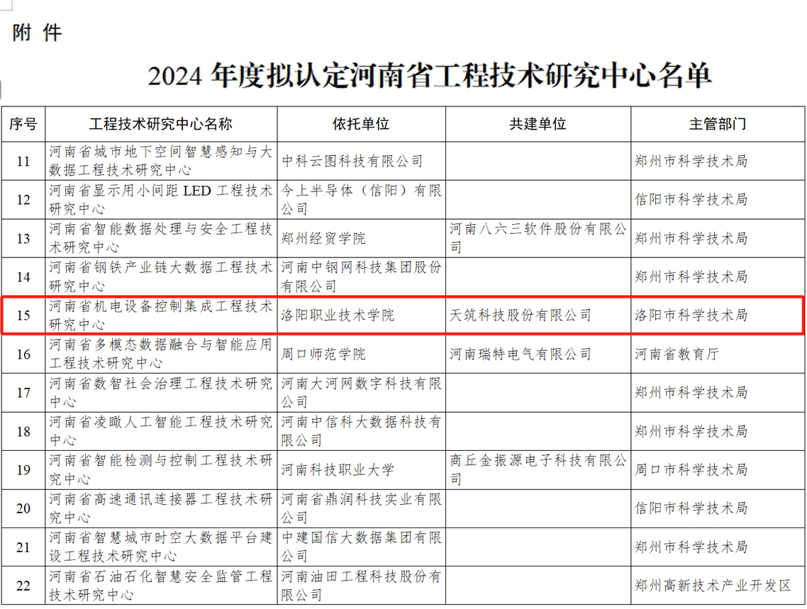 近日,河南省科技厅公布2024年度拟认定河南省工程技术研究中心名单,由我校信息工程学院牵头,与天筑科技股份有限公司共同申报的河南省机电设备控制集成工程技术研究中心成功获批,标志着我校在建筑机电设备控制集成领域科研项目取得新突破。