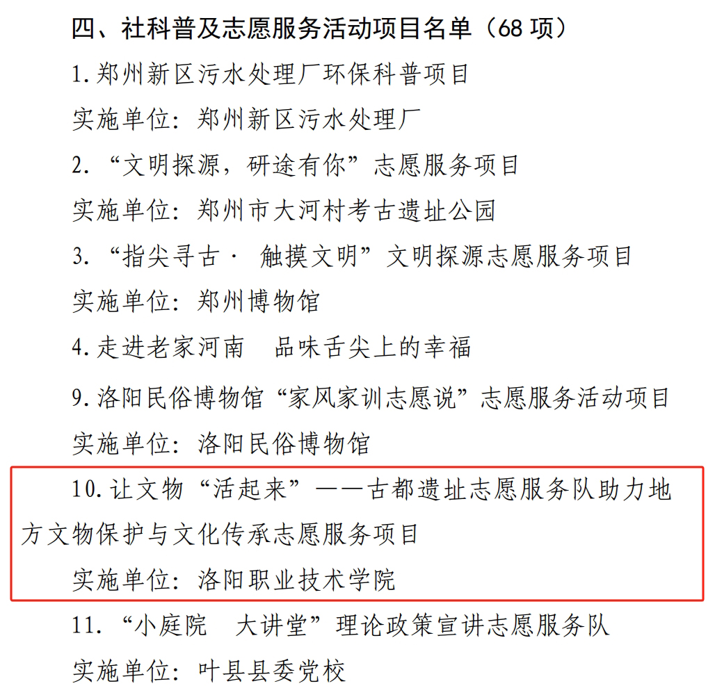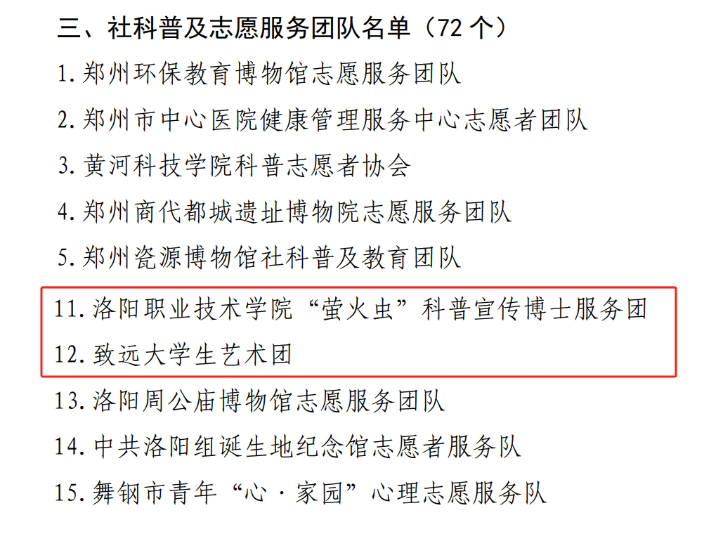 其中,会计学院院长刘潇阳入选社科普及指导员表扬名单,文物保护考古学院《让文物“活起来”--古都遗址志愿服务队助力地方文物保护与文化传承志愿服务项目》入选社科普及志愿服务活动项目表扬名单,食品与药品学院“萤火虫”科普宣传博士服务团、戏曲艺术学院致远大学生艺术团入选社科普及志愿服务团队表扬名单。