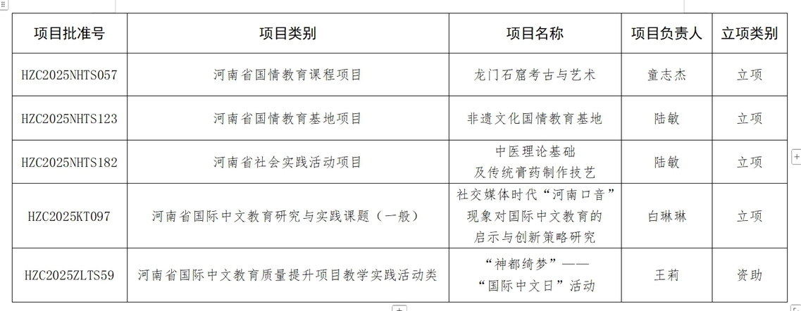 其中,我校项目《龙门石窟考古与艺术》获河南省国情教育课程项目立项,《非遗文化国情教育基地》获河南省国情教育基地项目立项,《中医理论基础及传统膏药制作技艺》获河南省社会实践活动项目立项,《社交媒体时代“河南口音”现象对国际中文教育的启示与创新策略研究》获河南省国际中文教育研究与实践课题立项,《“神都绮梦”——“国际中文日”活动》获河南省国际中文教育质量提升项目教学实践活动类立项。