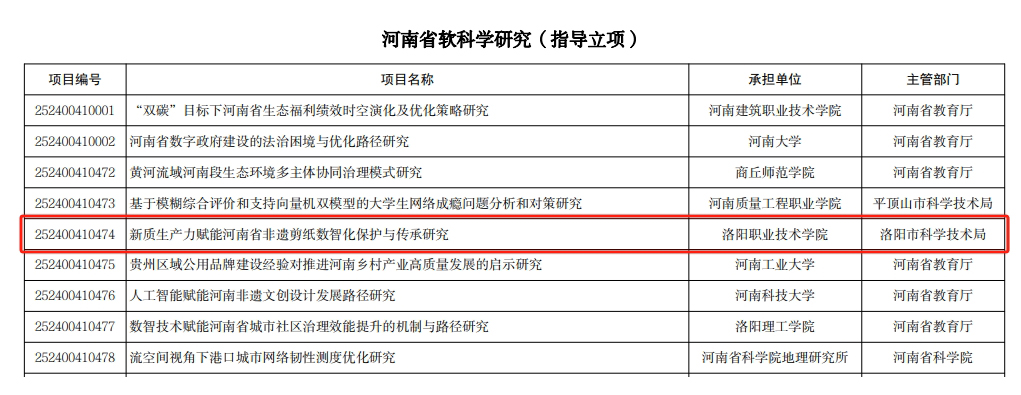 近日,河南省科技厅下达了河南省2025年科技发展计划,公布了河南省重点研发专项、河南省自然科学基金、河南省科技攻关、河南省软科学研究等项目立项名单。其中,我校文化遗产与传播学院教师王飞团队申报的“新质生产力赋能河南非遗剪纸数智化保护与传承研究”项目获批河南省软科学研究(指导立项)项目立项。