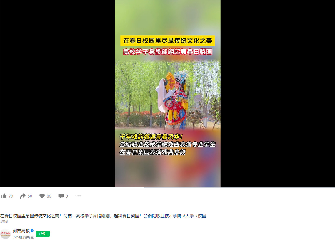 编者按:2025年3月31日,河南高教视频号报道洛职学子在春日校园里尽显传统文化之美!身段翩翩,起舞春日梨园!