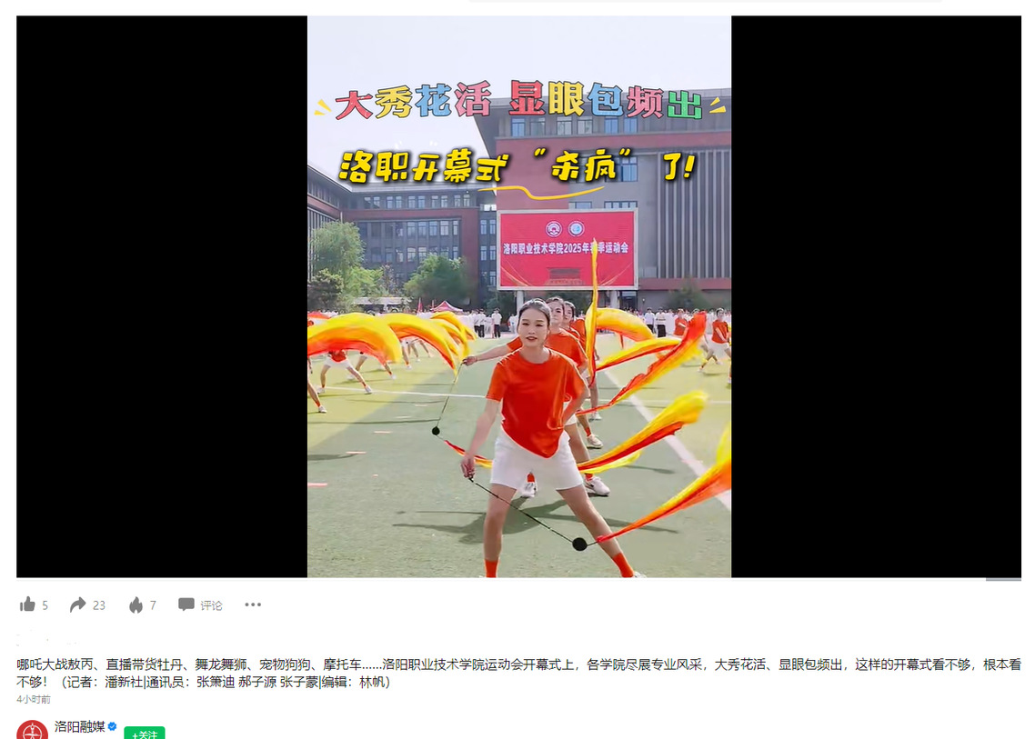 洛阳融媒:洛阳职业技术学院运动会开幕式上,各学院尽展专业风采,大秀花活。