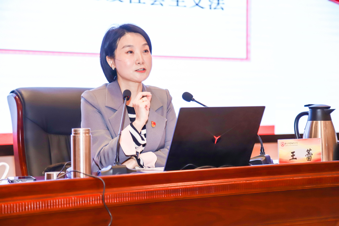 王蕾分别从习近平法治思想的重大意义、形成历程、核心要义、贯彻落实等四大方面进行详细讲解,深入解读了习近平法治思想,系统阐述了当前全面依法治国重点工作任务。王蕾表示,希望广大师生要认真学习习近平法治思想,悟出思想的“精髓”,学出内心的“信仰”,讲出真理的“味道”,研出实践的“真知”,出法治的“亮点”。