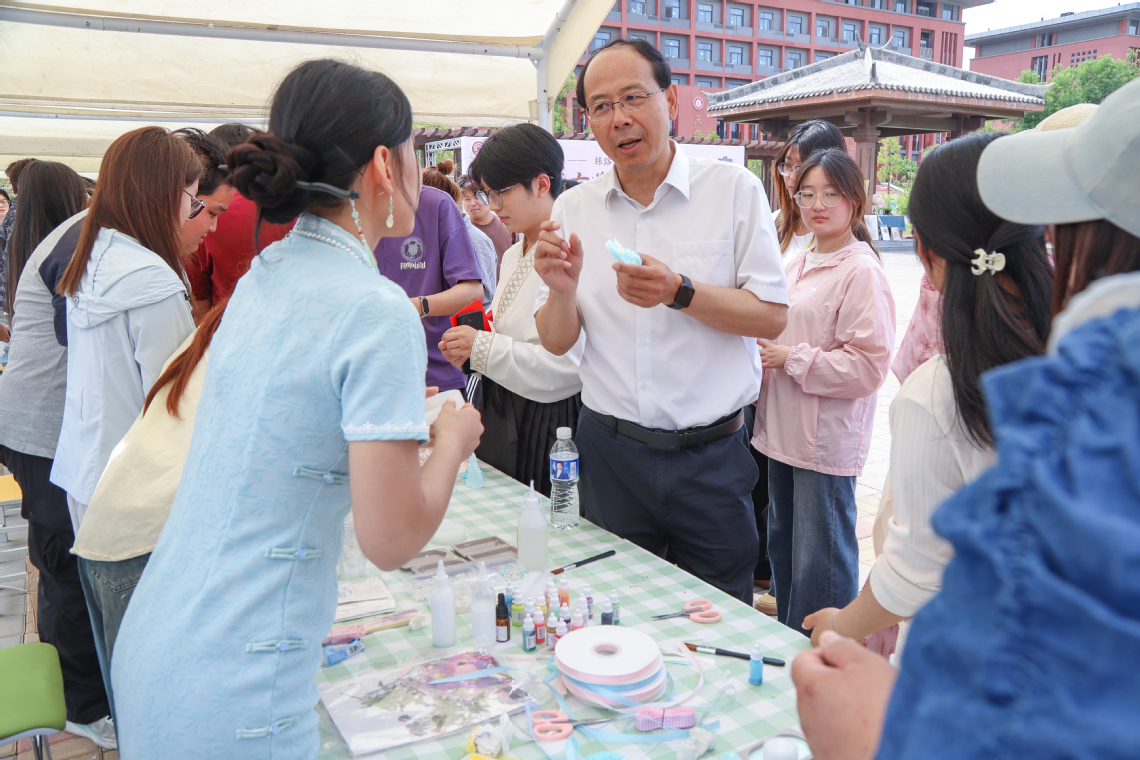 在“茶香驿站”,同学们学习点茶技艺,品鉴茶汤,体验宋代点茶;在“丹青驿站”,同学们把汉服传统纹样与二次元结合,制作出精美的唐代纹饰专属徽章;在“芳华驿站”,在专业老师和同学们的指导下,大家将洛阳的牡丹文化与丝绸之路的香料贸易相结合,用香料和花粉制作出了牡丹香牌;在“霓裳驿站”,同学们身着唐风汉服,体验唐代妆容,拍摄下国风照片,定格难忘瞬间;在“丝韵驿站”,师生们利用水拓技法创作丝绸纹样,制作水拓丝巾,模拟古代丝绸贸易;在“花语驿站”,传统绒花技艺格外吸引眼球,师生们通过学习非遗绒花,制作丝路主题发饰。
