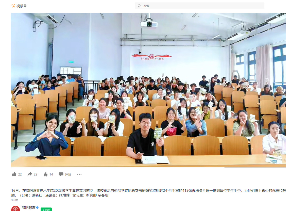 洛阳融媒:16日,在洛阳职业技术学院2023级学生离校实习前夕,该校食品与药品学院团总支书记魏笑将耗时2个月手写的415张祝福卡片逐一送到每位学生手中,为他们送上暖心的祝福和鼓励。
