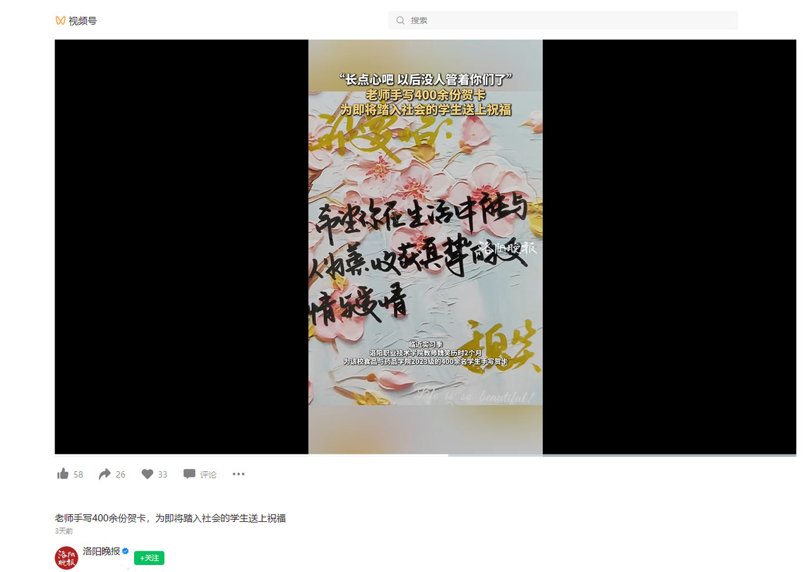 洛阳晚报:老师手写400余份贺卡,为即将踏入社会的学生送上祝福