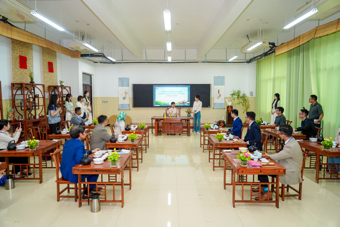 在茶艺实训室,这些国际友人观看了精彩的茶艺表演,并在老师的指导下,认真学起了冲茶、泡茶等茶艺以及喝茶、品茶的礼仪等,亲身感受历史悠久的传统茶文化,品尝各类中国名茶。