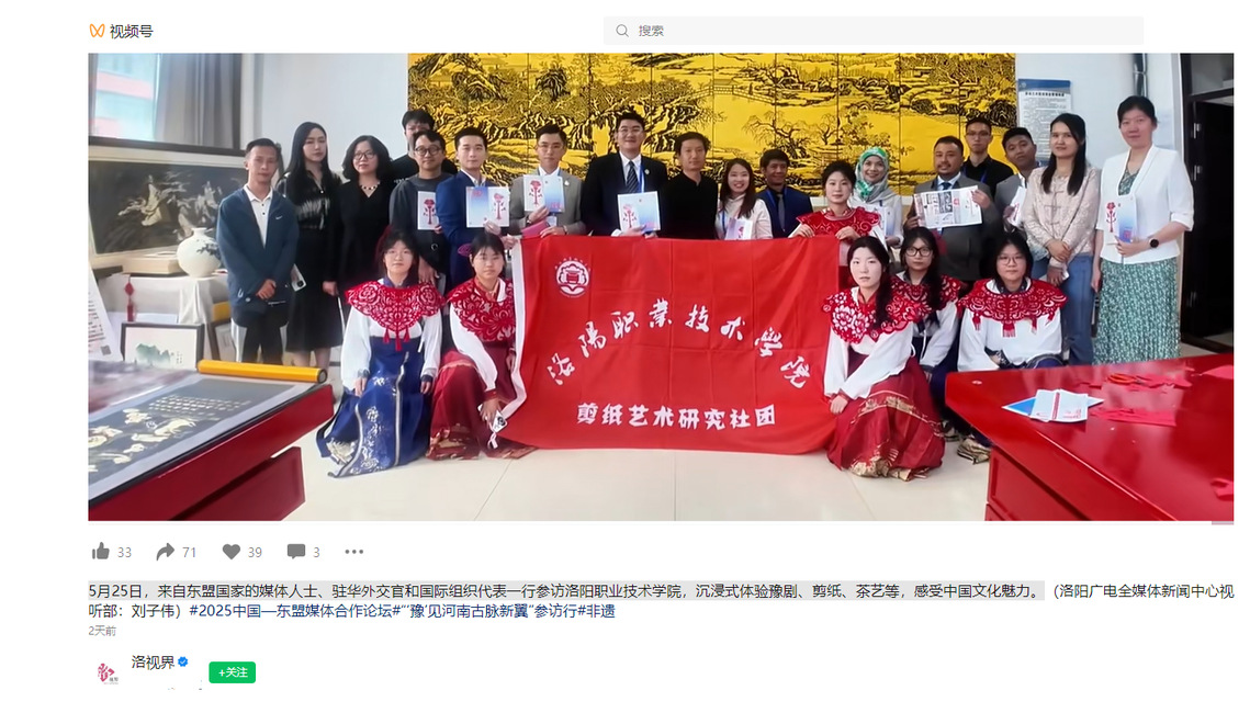 洛视界:5月25日,来自东盟国家的媒体人士、驻华外交官和国际组织代表一行参访洛阳职业技术学院,沉浸式体验豫剧、剪纸、茶艺等,感受中国文化魅力。