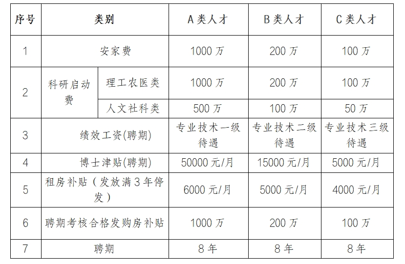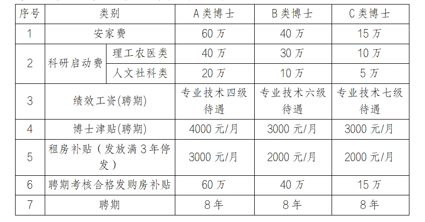 引进博士须签订聘用服务期协议,服务期不少于8年,按照聘用服务期协议享受下表待遇。