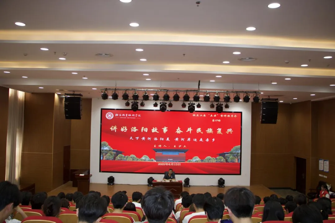 王少六凭借深厚的学术功底和丰富的人生阅历,将历史文献与考古发现、民间传说相结合,从历史脉络、文化基因、工业传承等多维视角解码洛阳的千年魅力,引导师生深刻理解古都的文化底蕴与时代使命。他用“牡丹文化”“二里头夏都遗址”“洛阳七大厂”“五都荟洛”“河图洛书”“龙门石窟”等十组关键词串联起洛阳的千年文脉,通过鲜活案例诠释了洛阳这座十三朝古都在文化传承与创新发展中的时代活力。他指出,洛阳作为河图洛书发源地与“一带一路” 重要节点城市,广大青年学子应当立足历史纵深、面向未来发展,讲好洛阳故事。