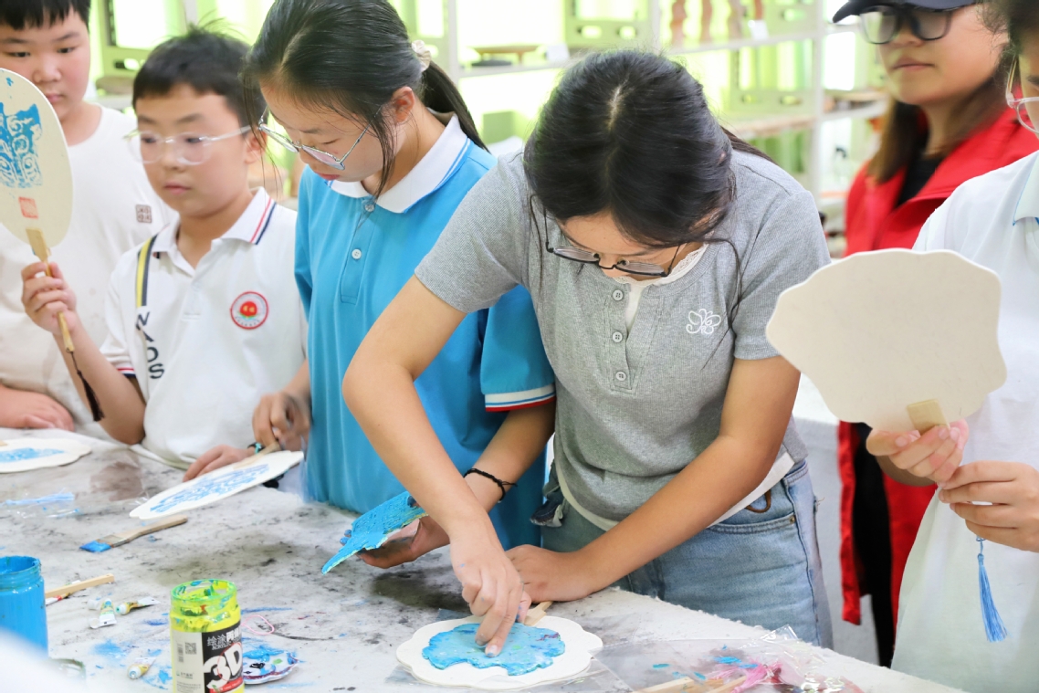 在“青铜器:夏朝的神秘礼器”探秘课堂中,学生们学习了青铜礼器的象征意义与铸造工艺,并在文博先锋实践团师生的帮助下认真学习拓印技艺,亲自动手制作青铜纹饰团扇,让古老纹样在指尖焕发新生。