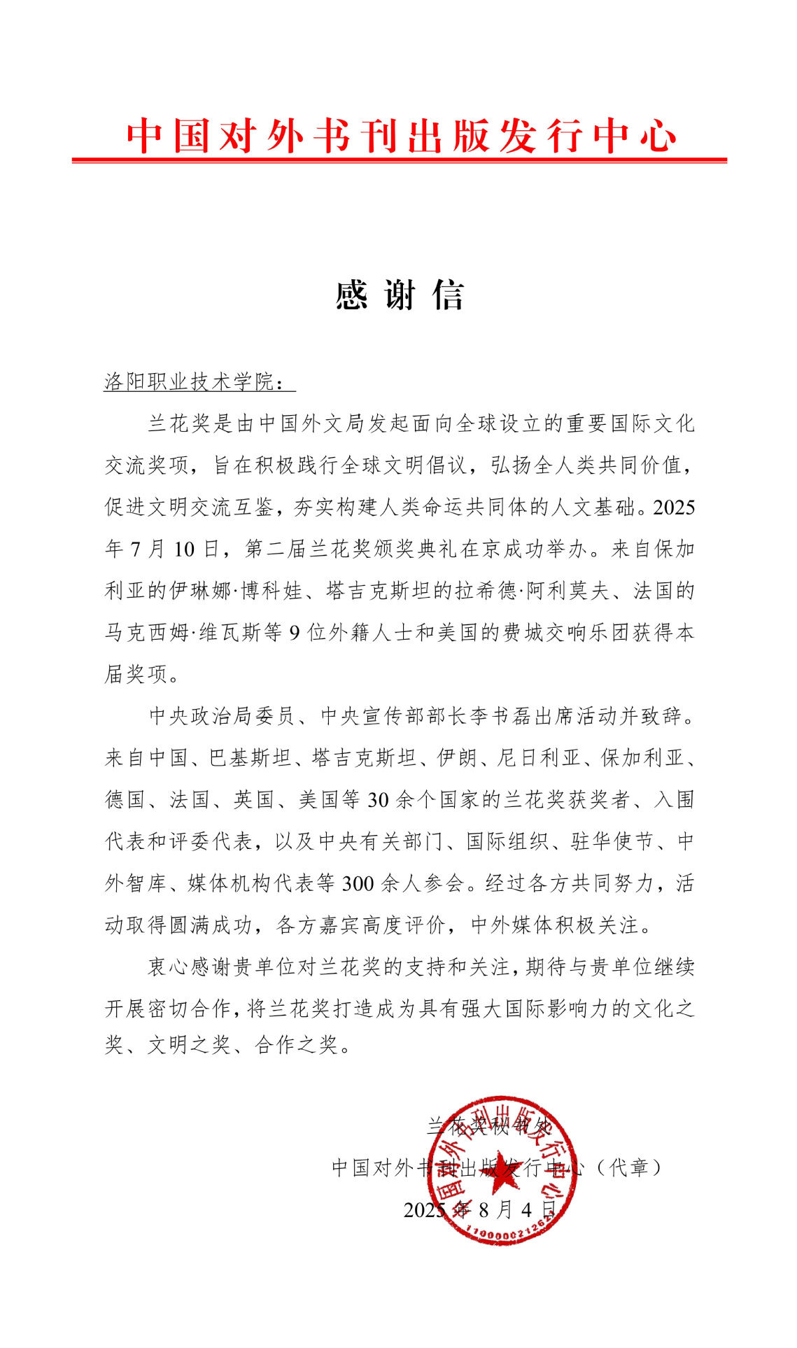 近日,我校收到中国对外书刊出版发行中心(兰花奖秘书处)发来的感谢信。信中对学校在第二届兰花奖中的支持与贡献表示感谢。
