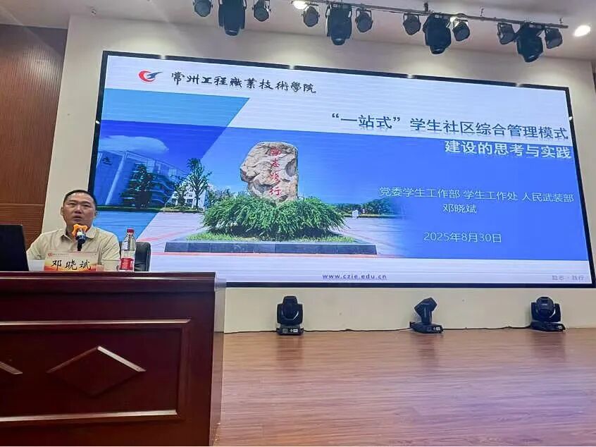 常州工程职业技术学院学工部部长邓晓斌以《“一站式”学生社区综合管理模式建设的思考与实践》为题,聚焦“一站式”社区怎么干的核心问题,紧扣教育部最新版提质增效指南,通过时间逻辑、理论逻辑、实践逻辑三个维度,从党建引领、队伍入驻、学生参与、文化建设、数字赋能、条件保障六个关键方面,深入浅出地讲解了常州工程职业技术学院社区建设的具体路径、特色做法与创新思路。