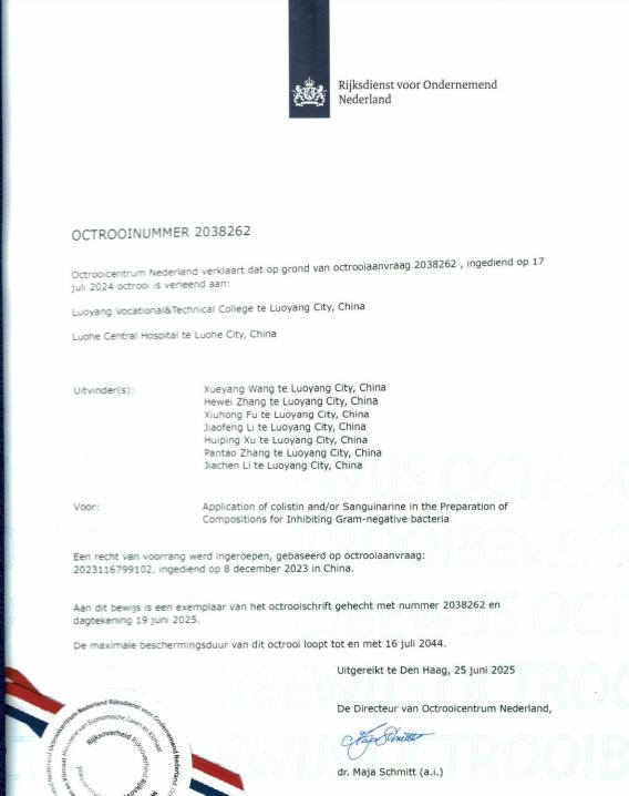 近日,我校食品与药品学院动物与人类健康团队最新研究成果《多黏菌素E和/或血根碱在制备抑制革兰氏阴性菌的制剂中的应用》成功获得荷兰国际专利授权,实现了学校在国际专利领域零的突破。