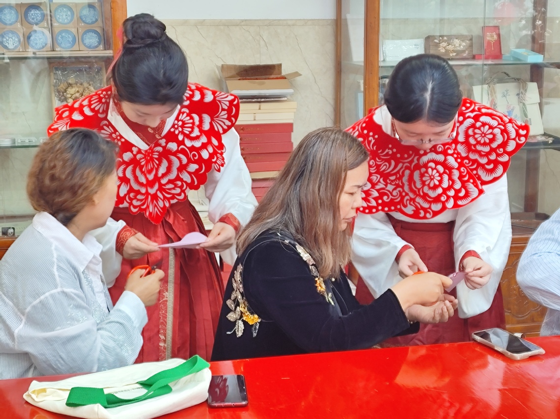 在“非遗创新与区域文化发展”专题课上,文化遗产与传播学院副教授王飞,结合河南与哈密两地的文化特点,探讨了非遗项目在现代公共文化服务体系建设中的作用与路径。在王飞剪纸大师工作室,学员们实地观摩了剪纸作品的创作过程,并亲身体验了非遗剪纸技艺,在王飞的指导下,学员们分别创作完成了具有地域文化特色的剪纸作品,切身感受传统手工艺的独特魅力与艺术价值。