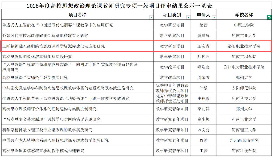 近日,教育部社会科学司公布了2025年度高校思想政治理论课教师研究专项一般项目评审结果。我校项目“工匠精神融入高职院校思政课教学资源库建设及应用研究”成功入选一般项目类别,成为全省高职院校唯一入选项目。