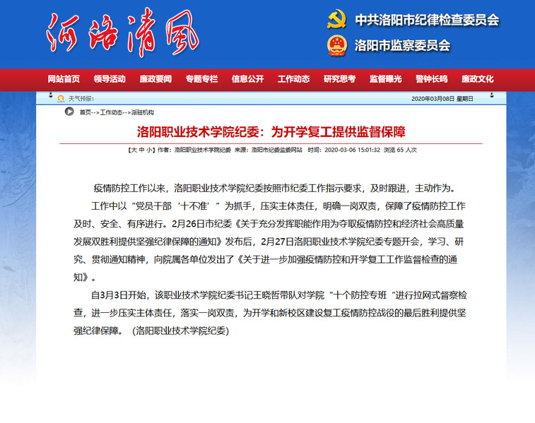 2020年3月6日,洛阳市纪委监委河洛清风网,刊登《洛阳职业技术
